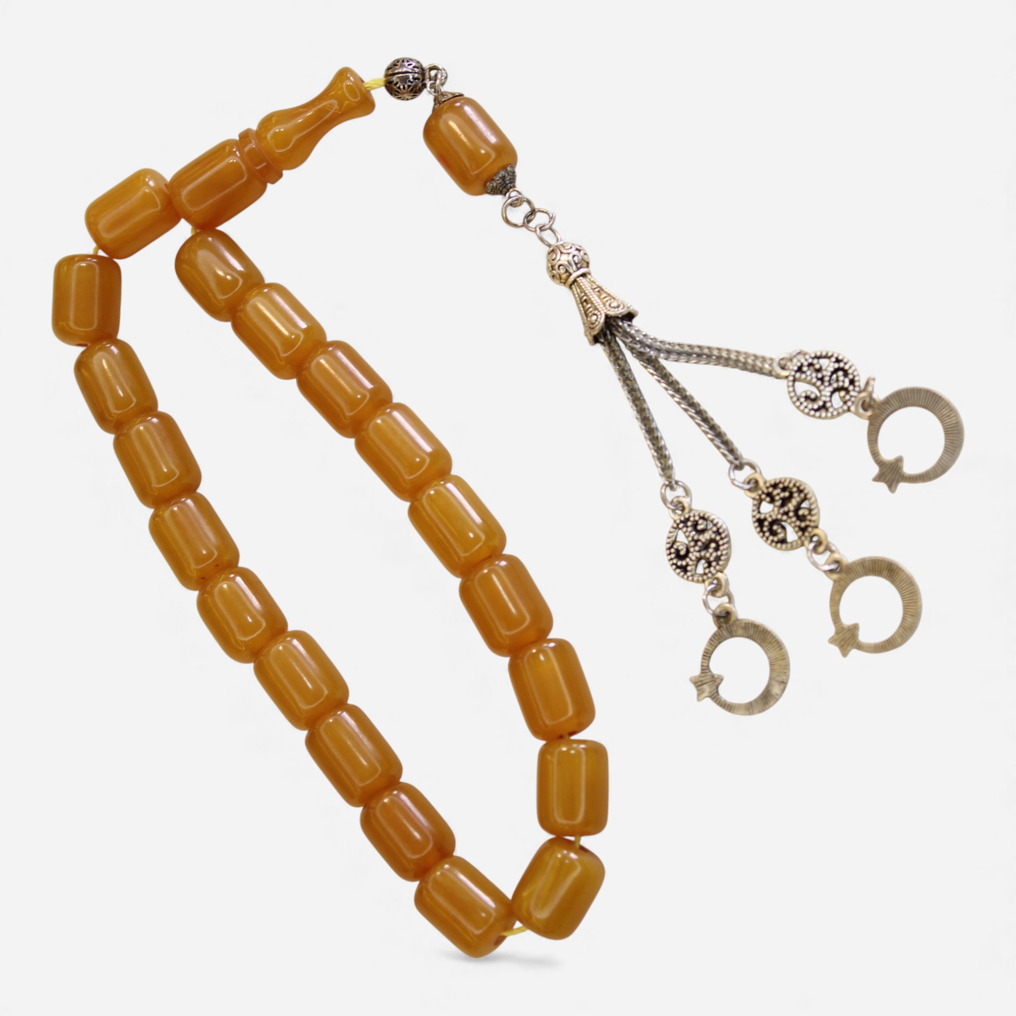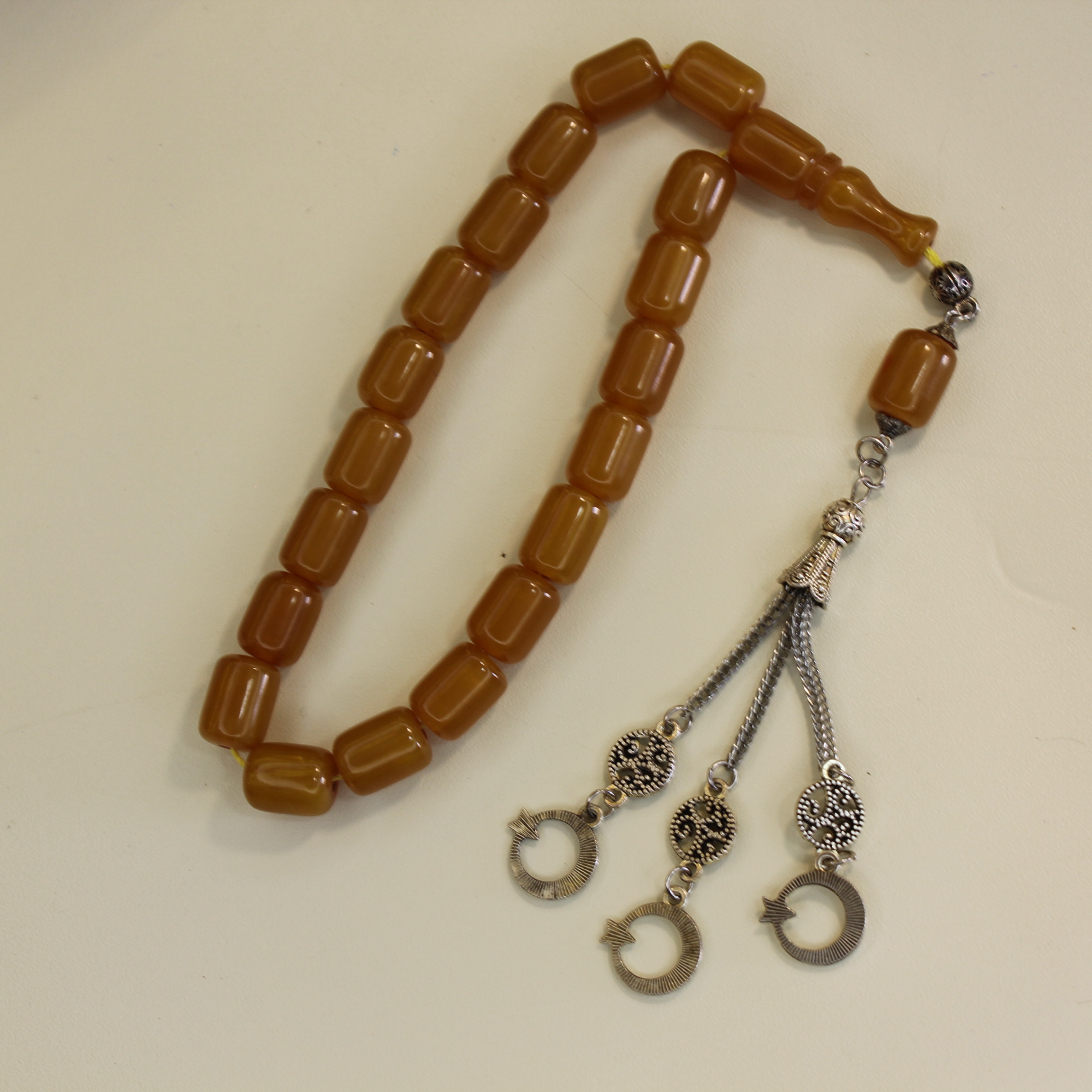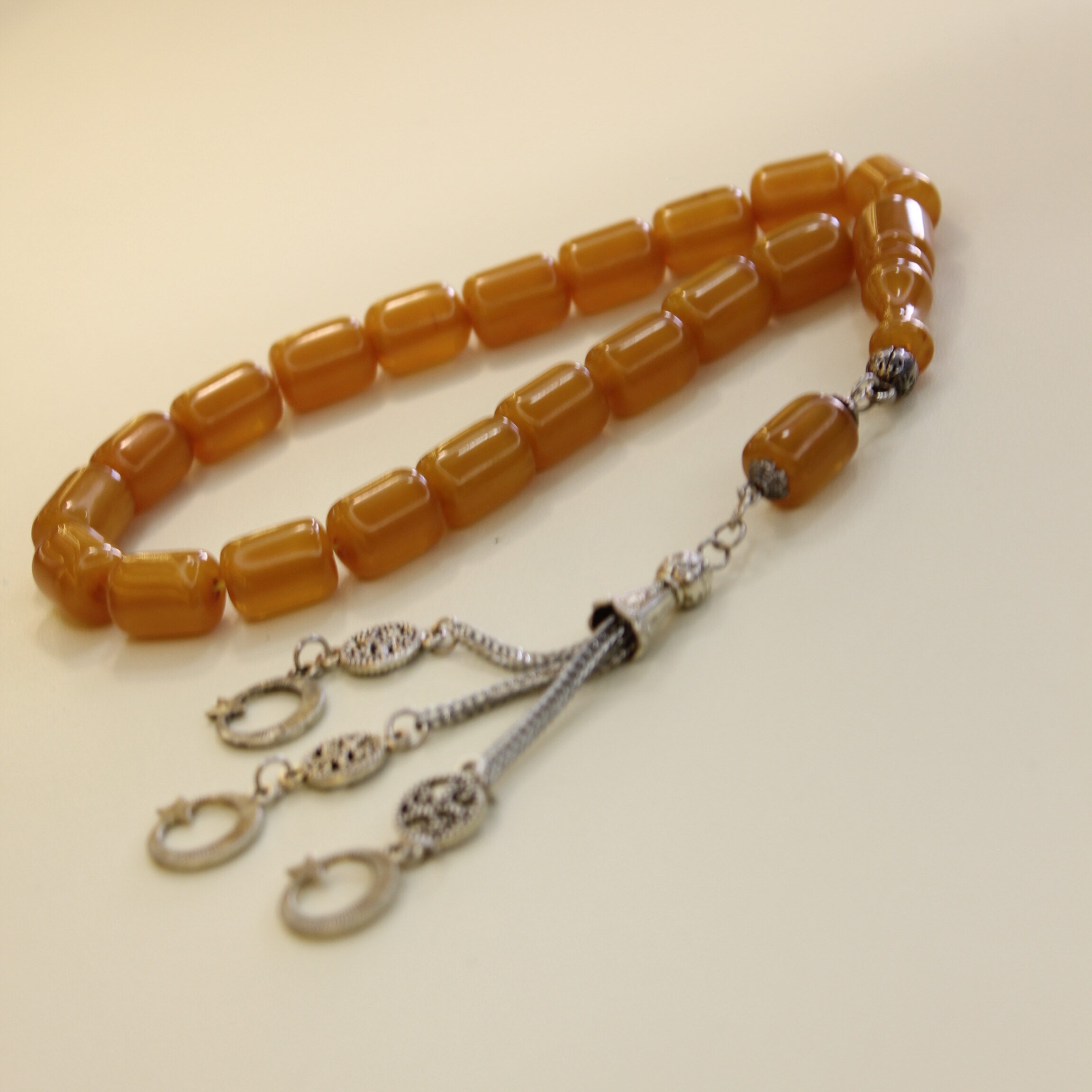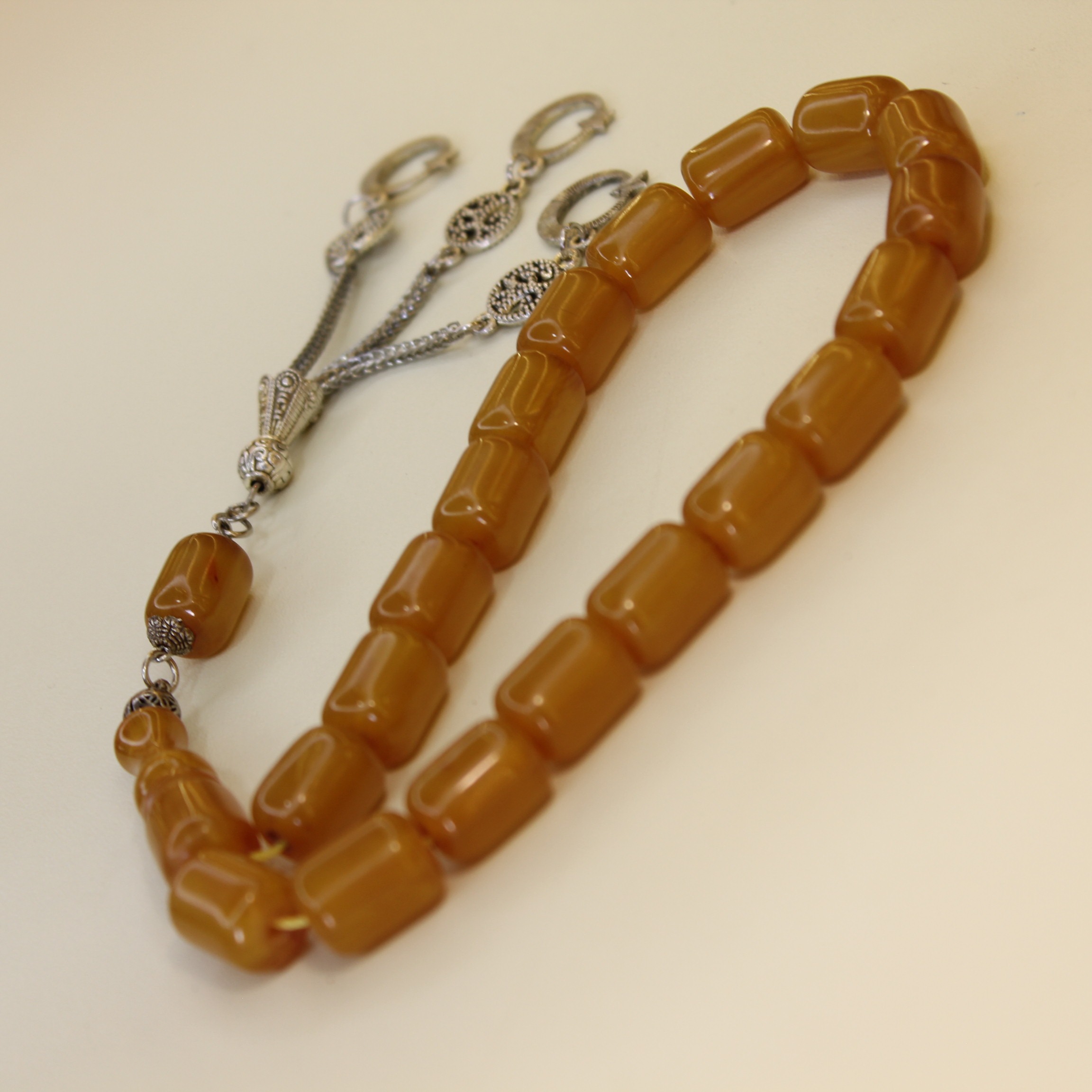 Təsbeh boncuklarının hər biri səliqəli hazırlanmışdır və eyni ölçüdədir. Bu, təsbehi daha səliqəli göstərir və istifadədə rahatlıq yaradır.Kəhrəbaların səthi hamar şəkildə cilalanıb, buna görə dənələr əldən rahat keçir və gündəlik istifadədə hissiyat baxımından narahatlıq yaratmır. Təsbehin ip hissəsi möhkəmdir və uzun müddət davamlı qalacaq şəkildə hazırlanmışdır. Bu səbəbdən təsbehi çantada, cibdə və ya masa üzərində saxlamaq rahatdır.