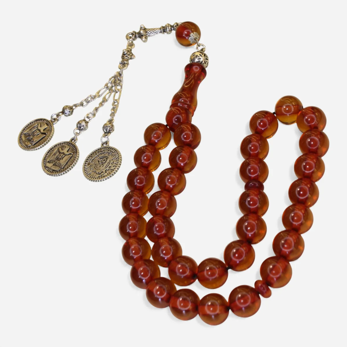 Sıxma kəhrəba materialından istehsal olunan bu təsbeh, incə işlənməsi, balanslı forması və estetik görünüşü ilə seçilir.
