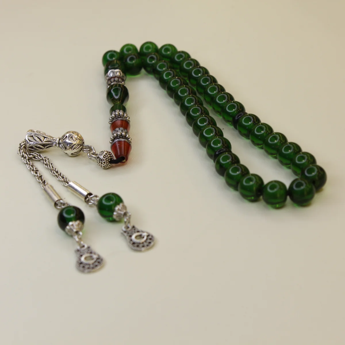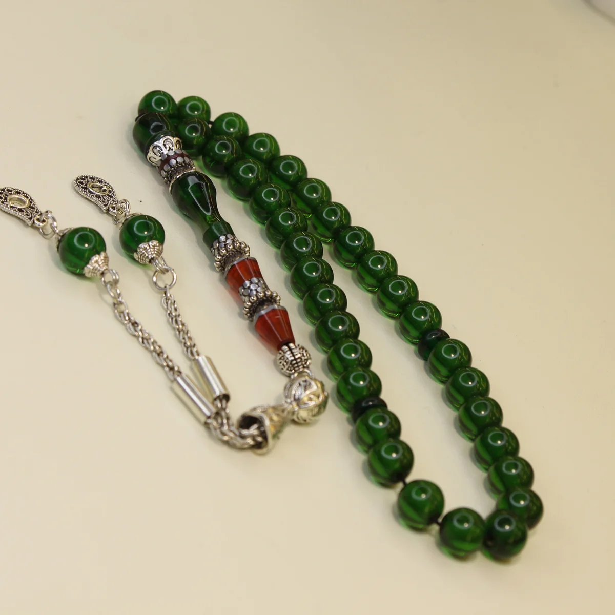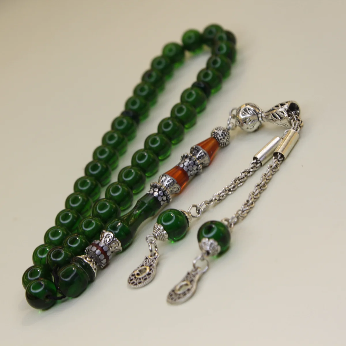 Naqqaşlı yaşıl yumru kəsim sıxma kəhrəba təsbeh, zövqlü görünüşü,