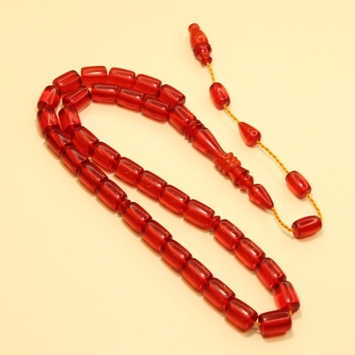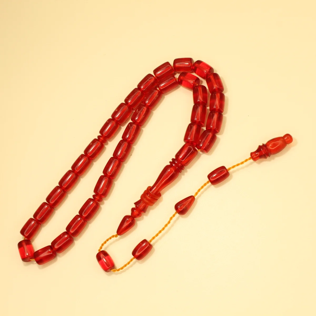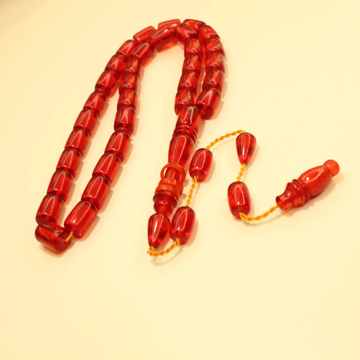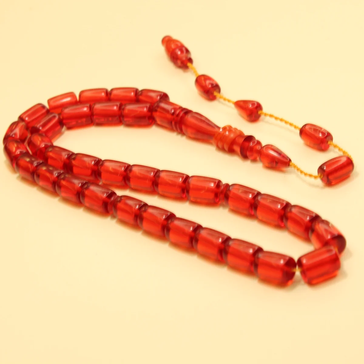 Sıxma kəhrəba materialı sayəsində həm davamlı, həm də rahat istifadəyə malikdir. Hər bir halqa dəqiqliklə cilalanmış, səthindəki parlaqlıq və hamarlıq onun yüksək ustalıqla hazırlandığını göstərir. İmamə hissəsi simmetrik şəkildə işlənib, təsbehin ümumi balansını və vizual harmoniyasını təmin edir. Qırmızı rəngin dərin çalarları, məhsula xüsusi xarakter və incəlik qazandırır.