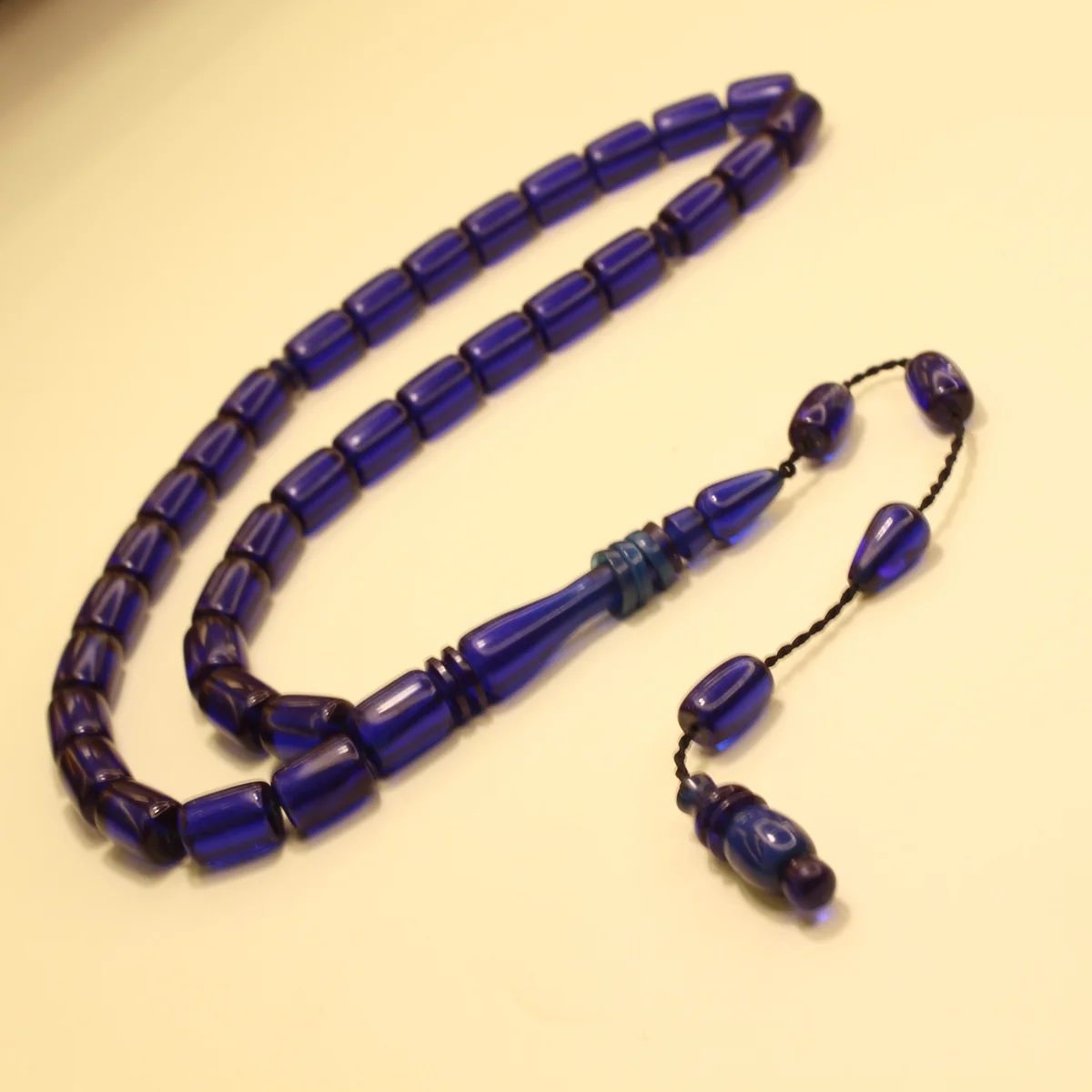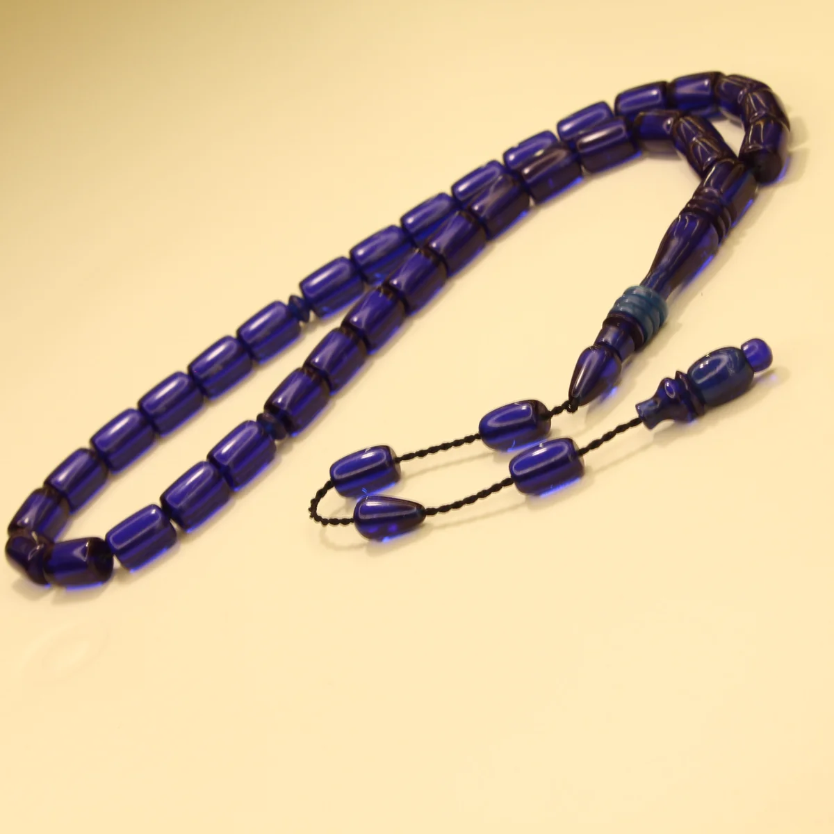 Tünd Mavi Silindir Kəsim Halqalı İmaməli Sıxma Kəhrəba Təsbeh